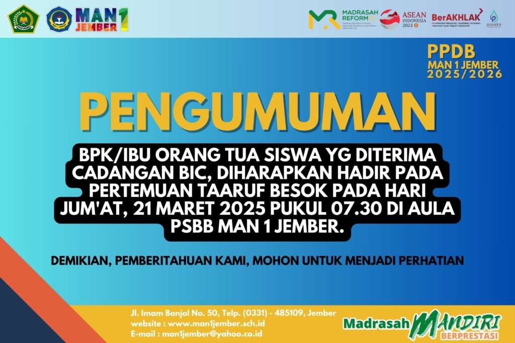 PENGUMUMAN Diinformasikan kepada Bapak/Ibu Orang Tuga Siswa yang diterima CADANGAN Program BIC, diharapkan hadir pada : Acara : Pertemuan Ta’aruf Hari : Jum’at , 21 Maret 2025 Pukul : 07. 30 WIB Tempat : Aula PSBB MAN 1 Jember Demikian, pemberitahuan kami, mohon untuk menjadi perhatian.