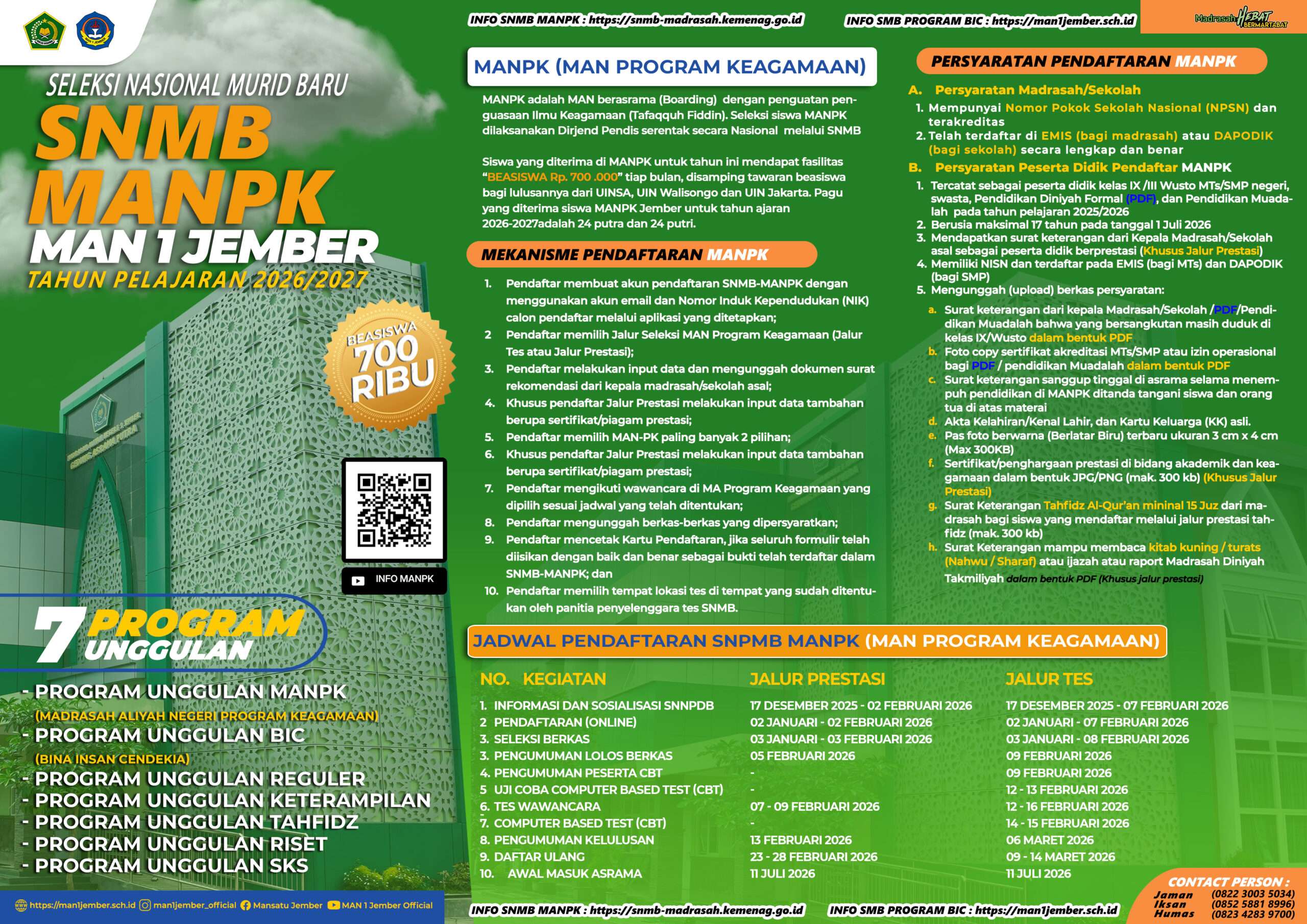 MANPK adalah MAN berasrama (Boarding) dengan penguatan penguasaan ilmu keagamaan (Tafaqquh Fiddin). Seleksi siswa MANPK dilaksanakan Dirjend Pendis serentak secara nasional melalui SNPDB. Siswa yang diterima di MANPK untuk tahun ini mendapat fasilitas "BEASISWA Rp. 700.000" Tiap Bulan, disamping tawaran beasiswa bagi lulusan dari UNISA, UIN Walisongo dan UIN Jakarta. Pagu yang diterima siswa MANPK Jember untuk tahun ajaran 2025-2026 adalah 24 putra dan 24 putri