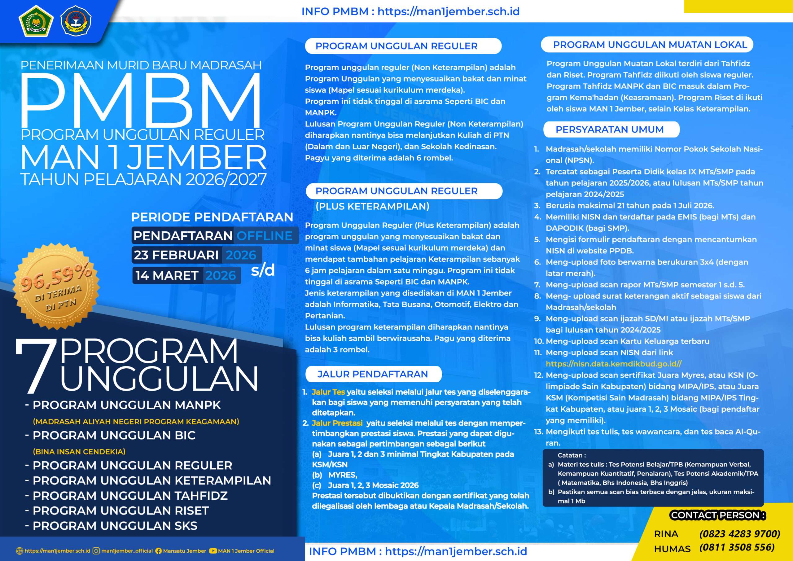 Program Unggulan Reguler ( Plus Keterampilan ) adalah program unggulan yang menyesuaikan bakat dan minat siswa ( Mapel sesuai kurikulum merdeka ) dan mendapatkan tambahan pelajaran keterampilan sebanyak 6 jam pelajaran dalam satu minggu. Program ini tidak tinggal di asrama seperti BIC dan MANPK. Jenis keterampilan yang disediakan di MAN 1 Jember adalah Informatika, Tata Busana, Otomotif, Elektro, dan Pertanian. Lulusan program keterampilan diharapkan nantinya bisa kuliah sambil berwirausaha. Pagu yang diterima yaitu 3 rombel